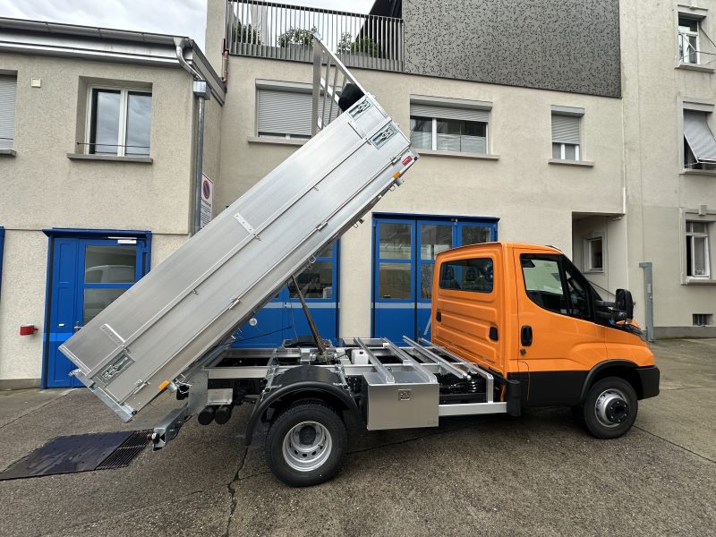 Die tiefe Aufbauhöhe des Dreiseitenkippers gibt durch den tieferen Schwerpunkt mehr Sicherheit und Komfort beim Beladen und Entladen. Das ausgeklügelte Kipperhydraulik-System ermöglicht ein rasches und sicheres Aufkippen beziehungsweise Absenken.